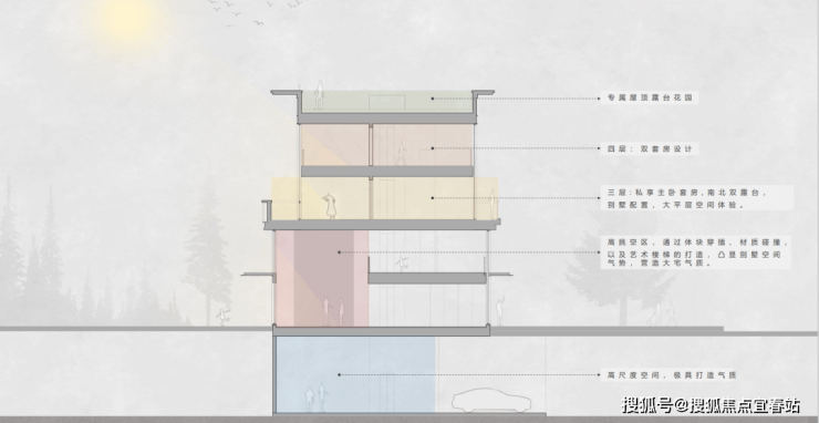 约6米层高,创新实现两层变四层,赠送地下室与前后双花园,实用率超200%。