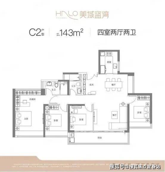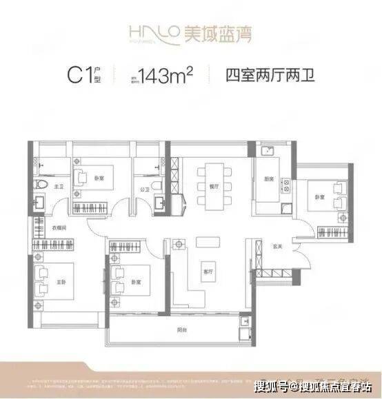 C2 户型:竖厅双龙抱珠格局,LDKB 一体化设计,同样五开间朝南,客厅开间 4.4 米,是项目最大客厅开间,主卧约 22.04㎡,配备 7.4 米长的巨幕大阳台,视野更开阔。