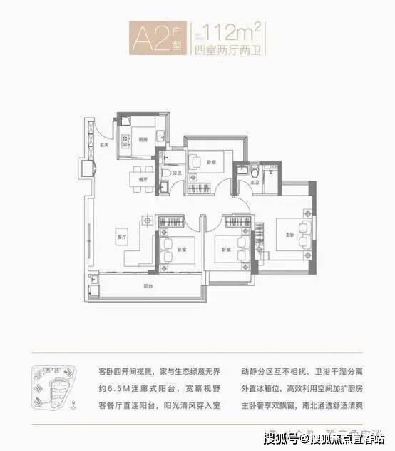 户型设计合理:户型为 98-144㎡的 3 至 4 房,格局方正,空间布局科学,多面宽采光,通透性强,户户有阔绰连廊式阳台,空间利用率高。