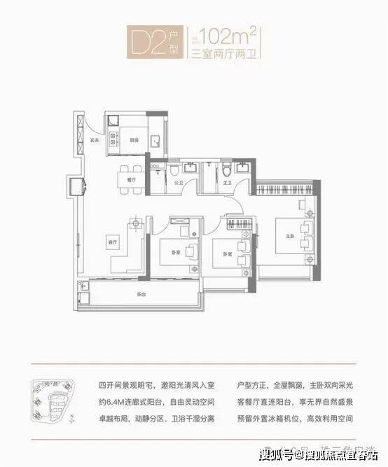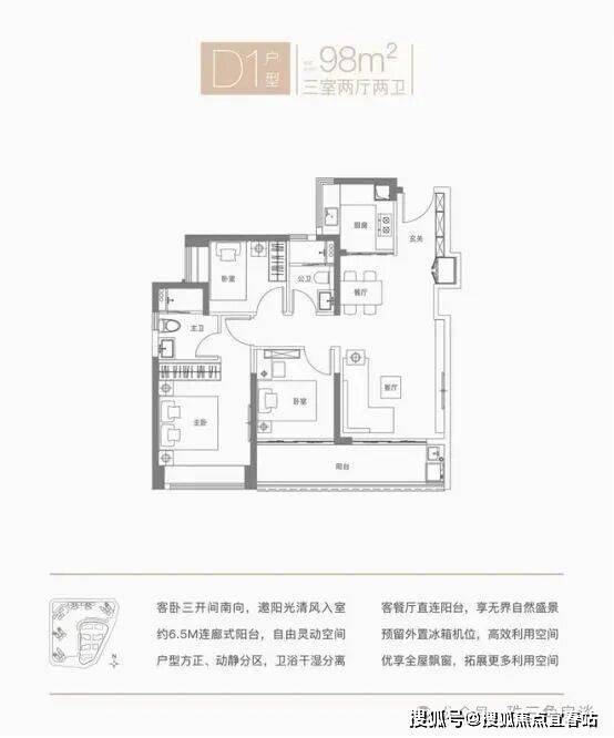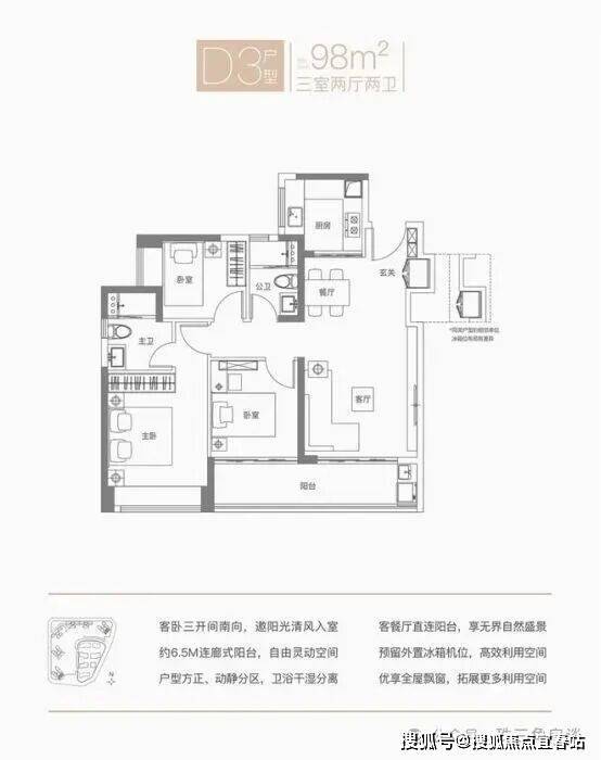 D3 户型:核心格局与 D1 一致,但朝向更佳,为全系东南朝向,阳台、卧室采光面更优,居住体验更舒适。
