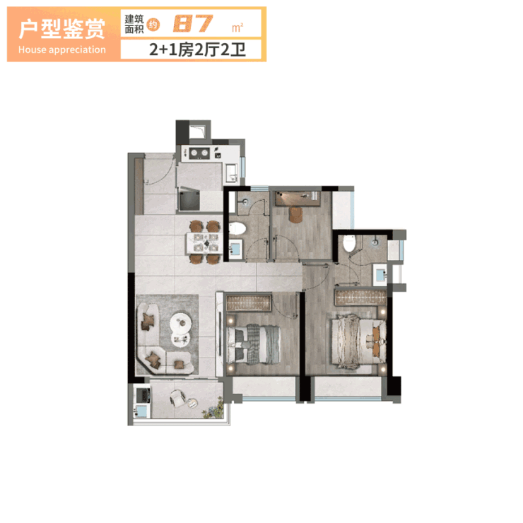 没错,约87㎡做到三房两卫,从二人世界到三口之家,皆能完美过渡,户型亮点更是满满。