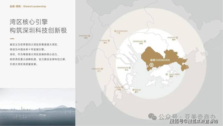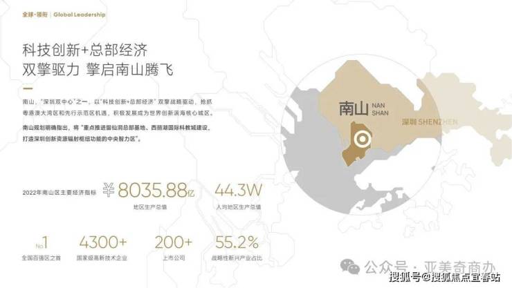 南山中心,一轴(科技创新轴)一带(总部经济带)交汇辐射区,深圳湾优质发展圈中心点,前、后海黄金走廊中心,南山中心半岛融合、深港双城协同发展的未来高地