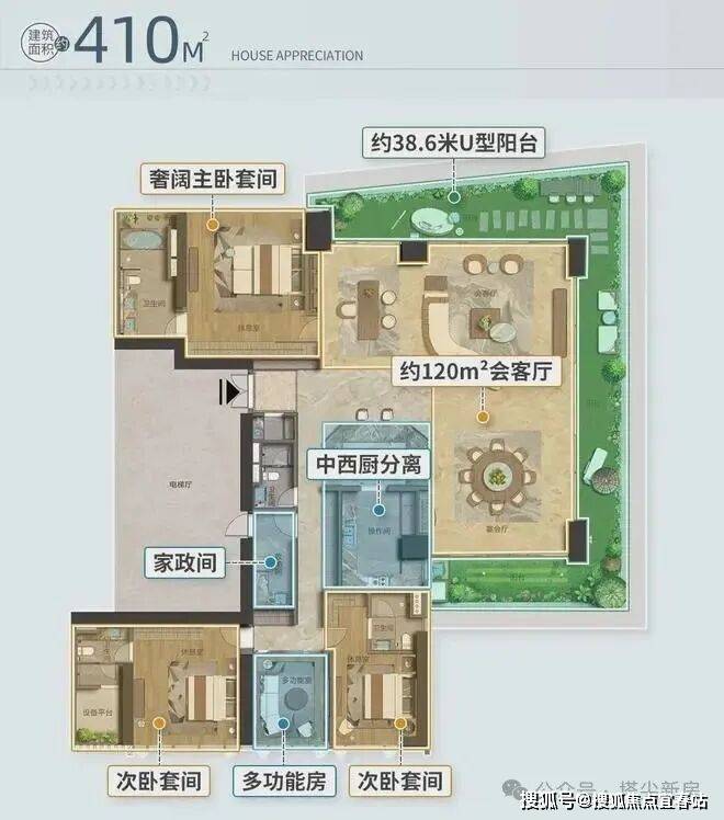 3.6米层高+320°U型阳台+三面采光+全落地窗+超大会客厅的极致空间尺度。