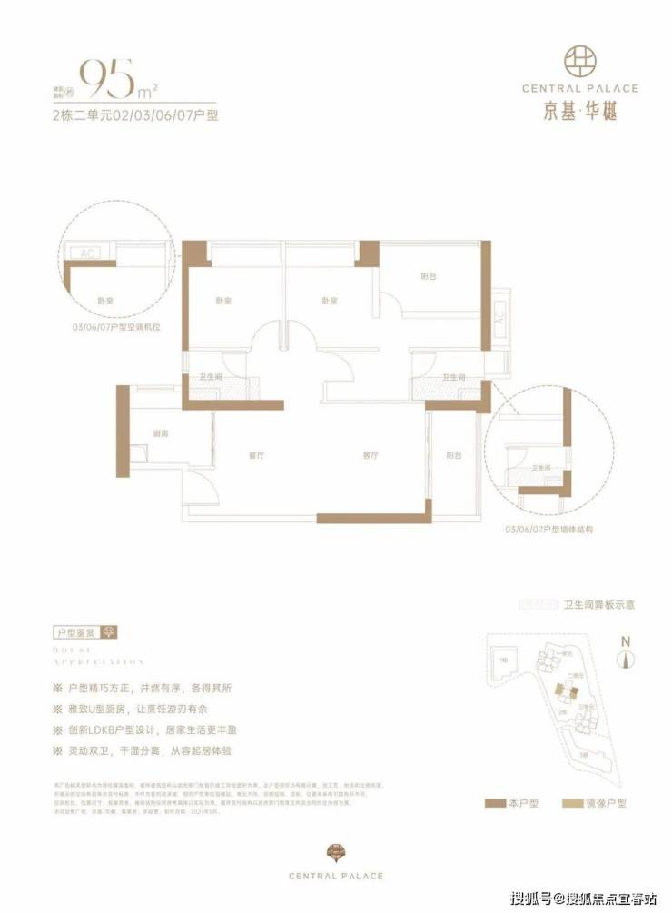 仅2栋2单元05户型才有,设计的是经典竖厅格局,LDKB一体化,动静分区,四开间朝南,U型厨房,卫生间干湿分离,得房率约73%(不含赠送),阳台西南朝向。