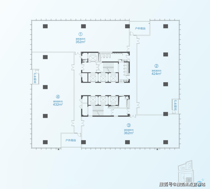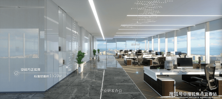 研发办公B座 约2.8万㎡,23层,标准层约1570㎡,层高4m,荷载300kg/㎡,每层4户,户型面积区间约352-432㎡,其中2户配私享阳台,每层设双共享阳台,顶层超大景观阳台。