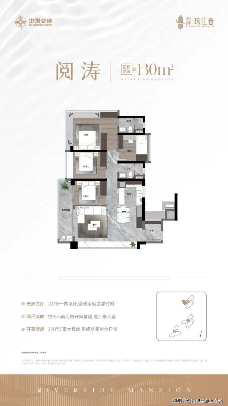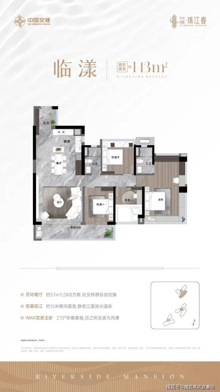 3. 户型设计: 珠江春项目主推130㎡、143㎡、180㎡大户型,均为全南向设计,使用率超110%,提供宽敞舒适的居住空间。