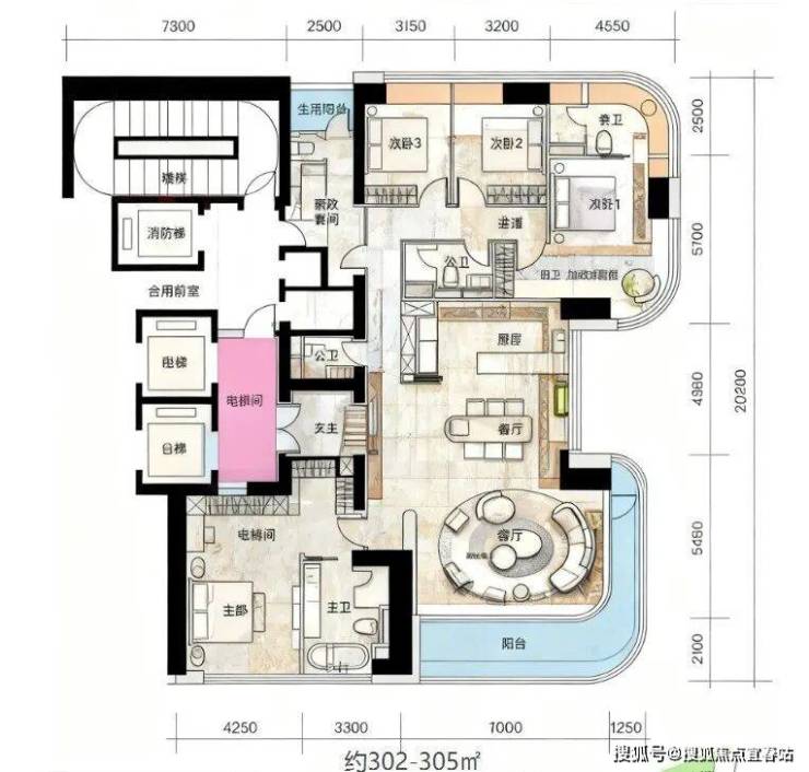 一层两户,经典大平层:约303㎡主力户型,空间布局方正大气,功能完备。