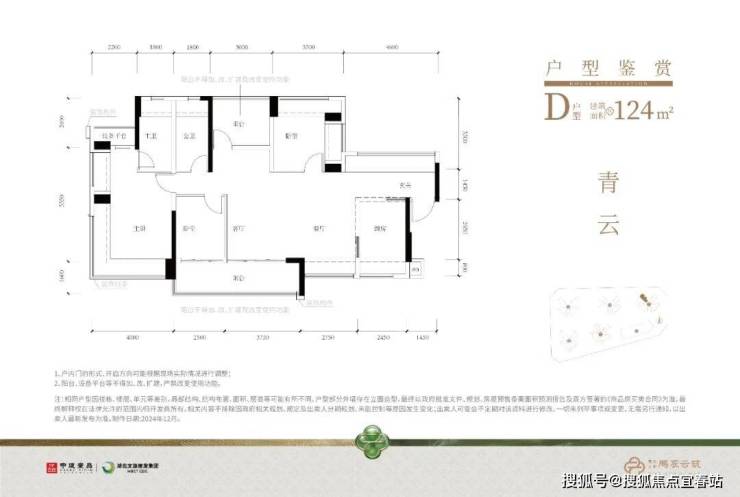 124㎡的4房2厅2卫,设计的是横厅南北通透格局,进门入户玄关,客餐厅6.35米开间,4个卧室分别做到了主卧20.95㎡/次卧10.58㎡/次卧9.45㎡/次卧7.2㎡(包含墙体飘窗),主卧+1个次卧270°飘窗,另有1个收纳间3.43㎡,客厅连接次卧出6.3米长大阳台,L型厨房,得房率约103.7%(包含赠送),阳台主朝西南或东南向。