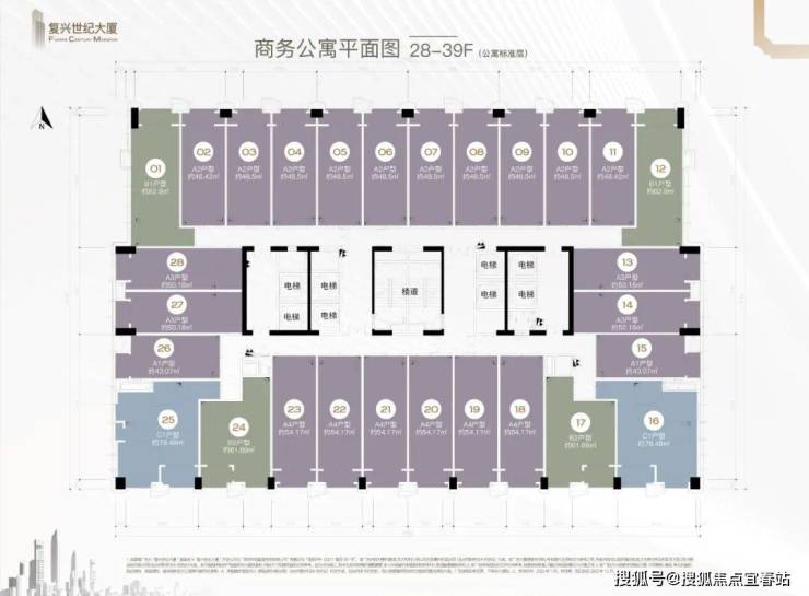 公寓8梯28户,办公6梯15户,商业4梯34户