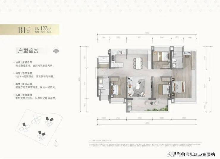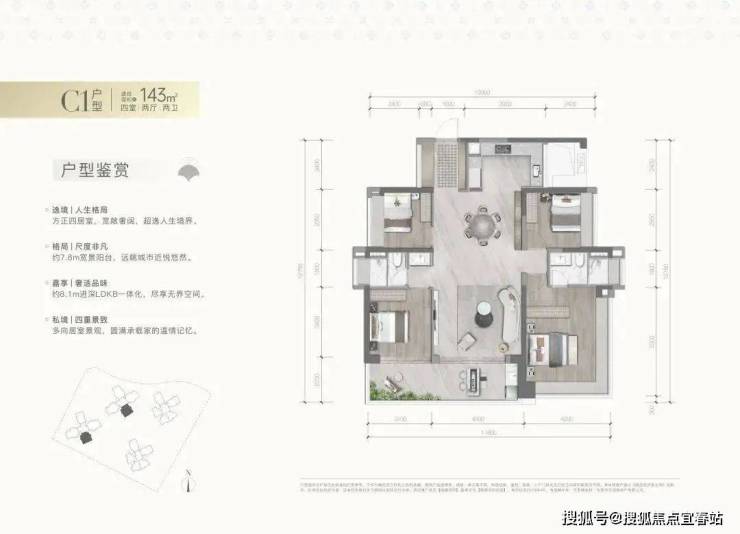 这是首批推出的最大户型,采用LDKB一体化设计出来的升级版四房户型,足以比肩其它产品的180+㎡的空间尺度感,属于可变4+1格局。
