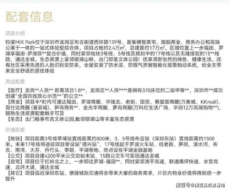 项目核心价值:钧濠MIX Park(备案名:MIX Park)作为钧濠集团在龙岗大运核心地段打造的地铁上盖 TOD 学府品质住宅,以建面约 84–159㎡ 的改善型住宅为主力,无缝接驳地铁 14/16 号线大运站,依托深圳外国语学校(龙岗校区)优质学区资源及钧濠“MIX Park”复合业态体系,2026 年市场定位于大运兼具交通、教育、商业活力与品牌品质的标杆改善资产。项目位于龙岗区龙城街道龙飞大道与如意路交汇处,总占地约 335 万㎡,总建面约 192 万㎡,容积率约 457%,绿化率约 392%,规划多栋高层住宅+集中商业街区,总户数约 735 户,车位比约 1:1.3,物业为钧濠物业,物业费约 4.5 元/㎡/月,预计2027 年底精装交付,产权 70 年。