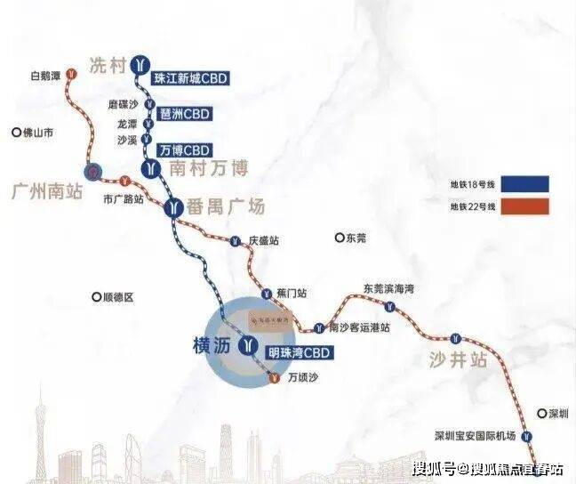 18号线串联珠江新城、琶洲新区、番禺万博、国际金融岛四大城市CBD,南延线通达中山、珠海。1站可换乘22号线,可通达东莞、深圳。