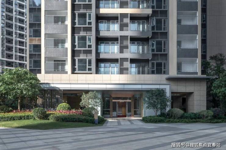 入户大堂采用简洁的L造型,营造半开放式的空间,主体运用石材、铝板和磨砂玻璃等现代材料营造归家的仪式感,两侧竖向格栅丰富外立面的层次感,同时引景入内,增加空间的趣味性。