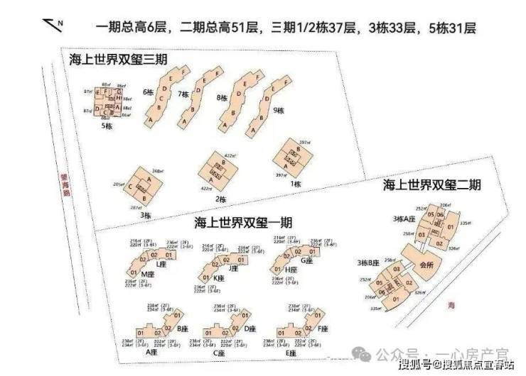 二期(海之门):2015年入市,2018年入伙,为51层双子塔超高层,A/B两栋由会所连接,户型205-335㎡,二期以“打破吉尼斯超高层住宅纪录”为标志,强调一线永久海景和地标属性,但塔楼设计导致部分户型通透性一般。