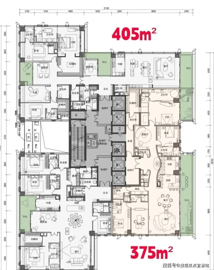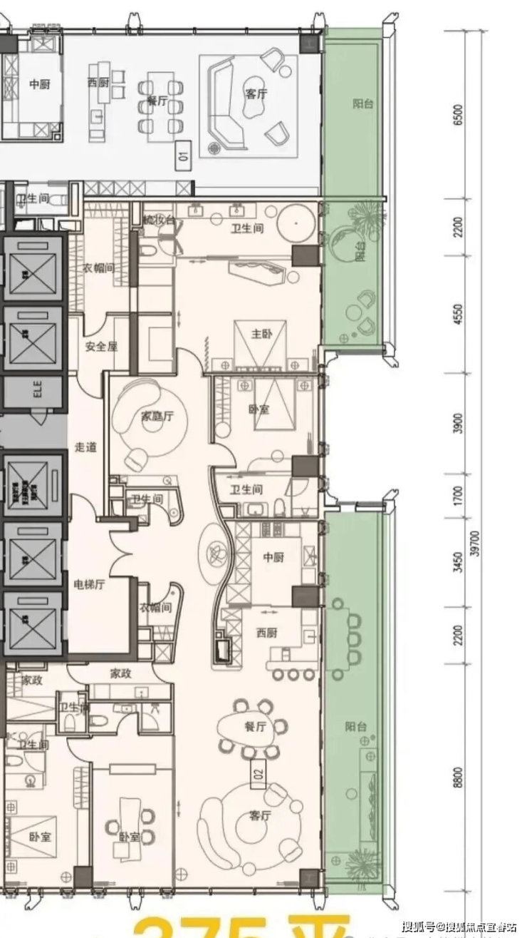 像375㎡户型,4+1房5卫设计,4个套间,约14.45米超长阳台可改造空中花园。