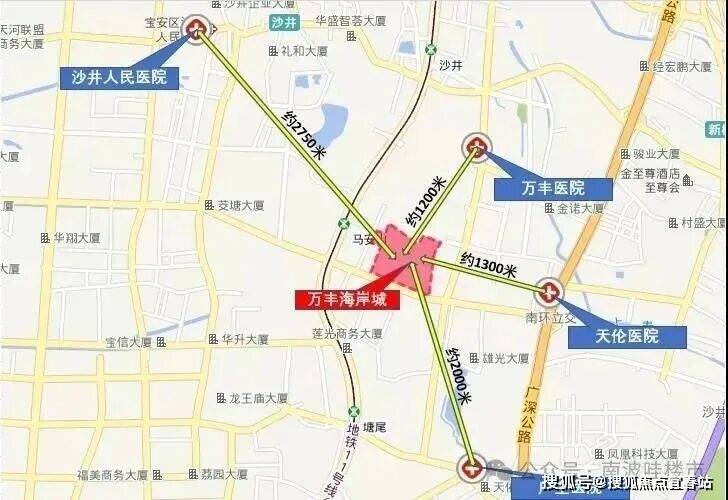 3km内沙井人民医院,项目1公里范围内分布有马鞍山社康,万丰社区社康,除此之外距离项目较近的两所医院是万丰医院和深圳天伦医院,日常小的身体不适可就近就医相对便利。离项目最近的大型公立医院是沙井人民医院,距离项目直线距离约2.75公里,距离稍远,缺少一定便利性,医疗借助交通工具通行。