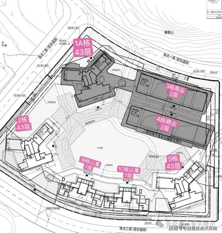 可以出售的商品住宅更靠近山体,位于03-01地块,分两期开发,共448户住宅,其中338户小于90㎡,最高楼层43层。