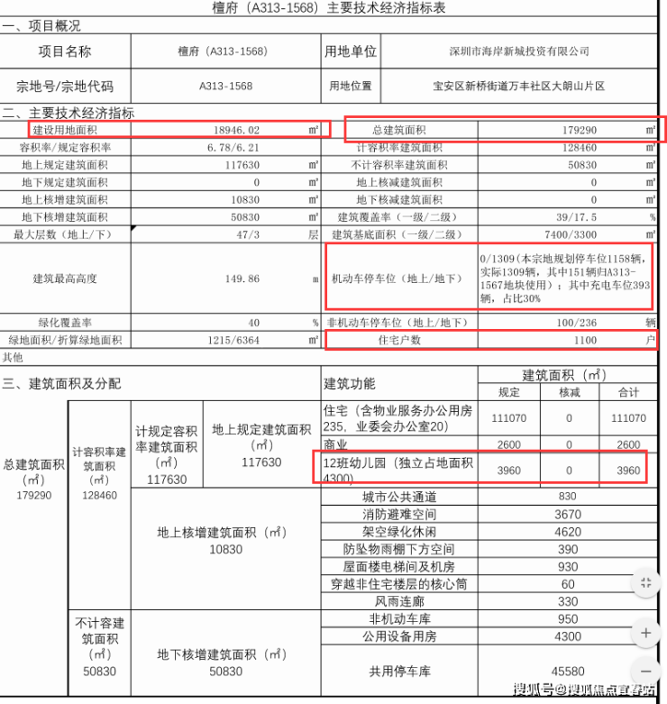 根据公示,檀府占面约18946㎡,总建面约17.9万㎡,计容建面约12.8万㎡,容积率6.7。其中,住宅建面约11.1万㎡,规划约1100套房源,机动停车位1309个。