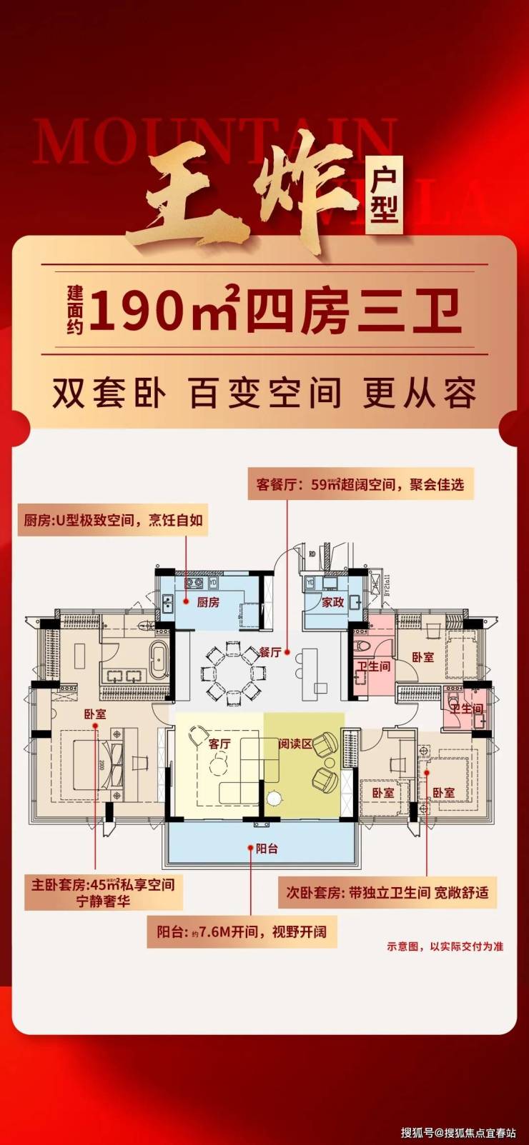 建面约190m²百变双套卧4房3卫:约59m²奢阔宽厅/约45m²奢华套卧