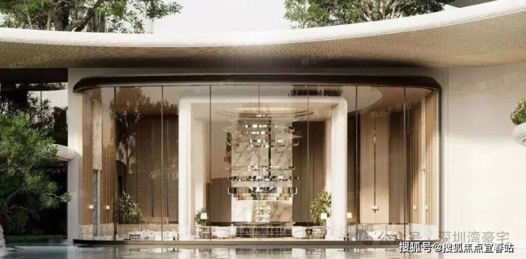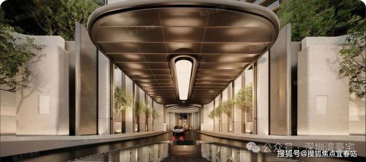 公区效果图:项目采用立体浮岛底盘设计,底部3层架空抬高,裙房布置万象系商业及社区配套,规划「地下落客-首层迎宾-上层漫游」三重立体归家礼序,约9米挑高车马厅搭配圆穹吊顶