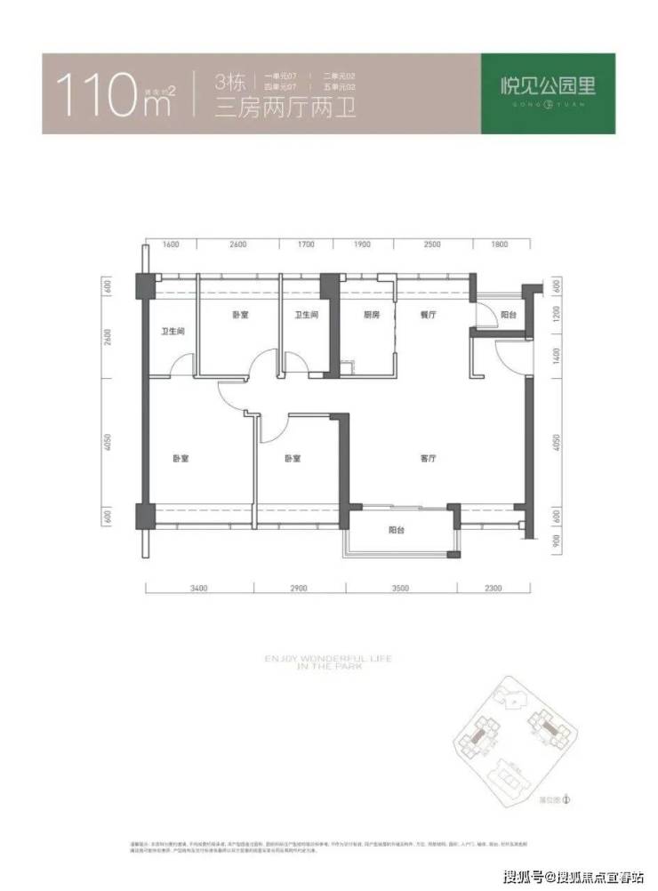 户型面积布局7110平三房两厅两卫设计的是横厅大开间格局,客厅5.8米开间,南北通透双阳台,三开间朝南,3个卧室分别做到了3.4米/2.9米/2.6米的宽度,U型厨房,公卫三段式分离,得房率73.71%(不含赠送),阳台主朝西南或东南向。