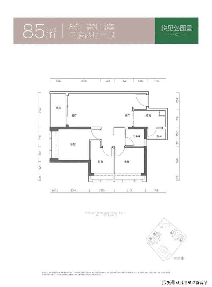 户型面积布局697平三房两厅两卫设计的是竖厅双龙抱珠格局,客厅3.4米开间,三开间朝南,3个卧室分别做到了3.2米/2.8米/255米的宽度,L型厨房带1个生活阳台,公卫三段式分离,得房率73.61%(不含赠送),东南朝向。