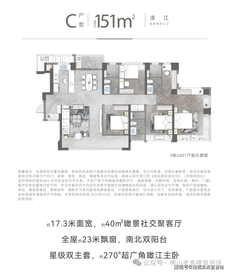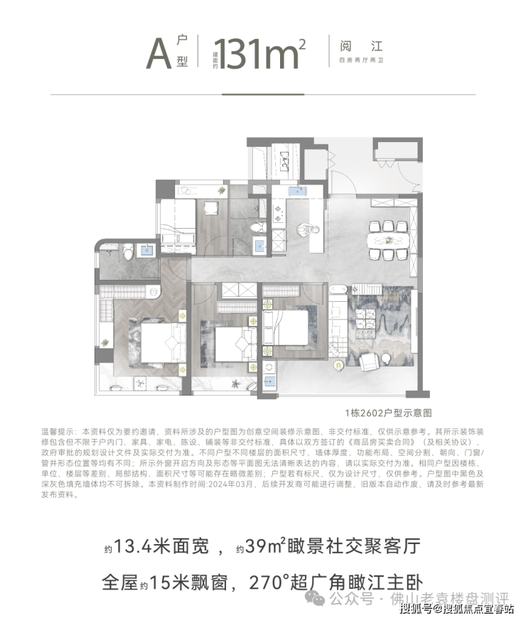 建筑立面采用钻感鎏金天幕,辉映顶部金色徽标,迭代区域居所的美学弯顶;约 130m 天幕地标,将楼体朝江旋转 15°户户东南向 270°观景实现江景平权的瞰江体验