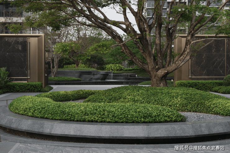 尚未进入社区,是约6.4米超长的威严门廊,门前搭配了造型别致的水景与罗汉松。