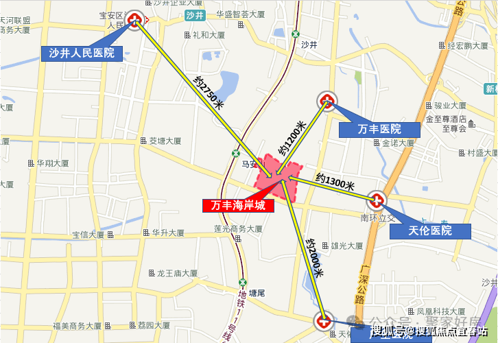 医疗: 项目1公里范围内分布有马鞍山社康,万丰社区社康,除此之外距离项目较近的两所医院是万丰医院和深圳天伦医院,日常小的身体不适可就近就医相对便利。离项目最近的大型公立医院是沙井人民医院,距离项目直线距离约2.75公里,距离稍远,缺少一定便利性,医疗借助交通工具通行。