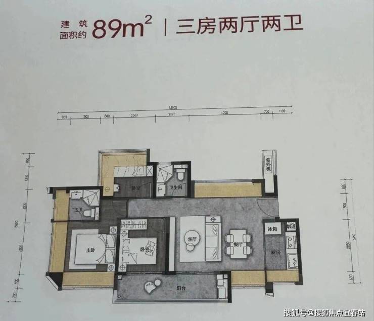 89㎡的3房2厅2卫,设计的是竖厅格局,客厅3.4米开间,LDKB一体化,S墙设计预留冰箱卡槽位,3个卧室分别做到了3.9米/2.9米/2.6米的宽度,客厅连接次卧出6.3米长的大阳台,L型厨房,卫生间干湿分离,有西北、西南或东南朝向。