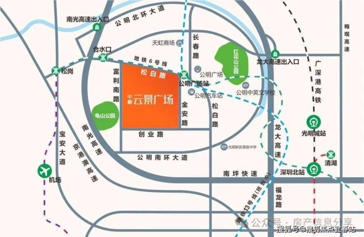双地铁上盖综合体:6号线/13号线(规划中)公明广场站联通云景悦街地下商业,6号线现已通车运行;周边地铁18、29号线规划中,南光、龙大双高速免费通行,便捷通达南山、福田中心;广深港高铁已投入使用,30分钟速达香港西九龙,赣深高铁的建设,实现粤港澳大湾区半小时生活圈