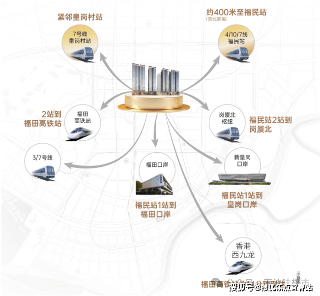 ·1站双口岸 ·2站福田高铁站 ·2站岗厦北枢纽 ·双地铁口 四地铁线