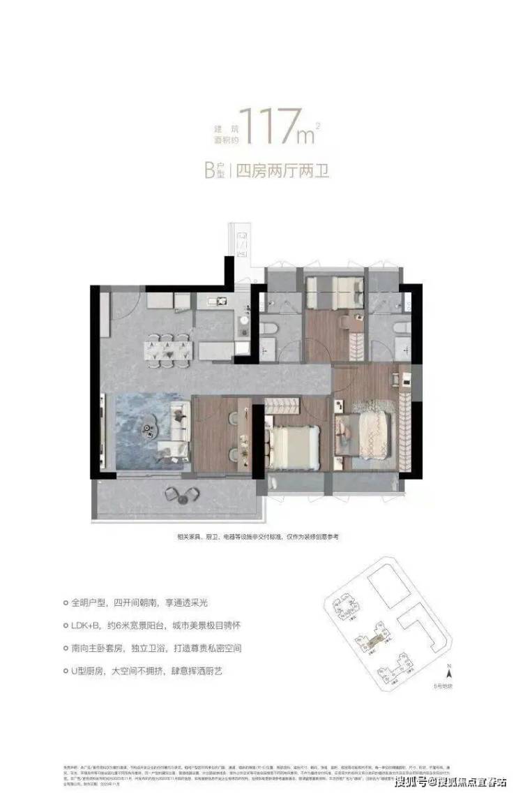 两个户型空间相似,125㎡是117㎡户型的plus版,南向全明4房,各功能间尺度较为舒阔,带宽景阳台,户型可塑性强。