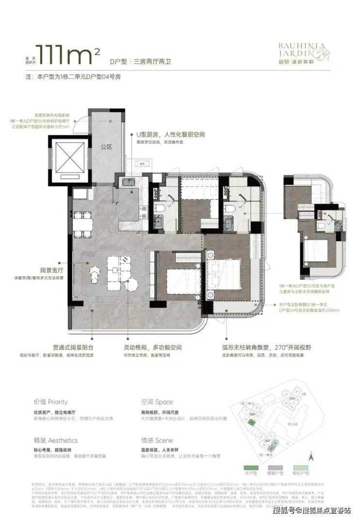 从空间布局来看,U 型厨房的设计极为人性化,大开间客厅与宽阳台是整个户型的最大亮点,西南向视野使得整个户型采光充足,贯通式阔景阳台与客厅、卧室双通,极大地拓展了生活空间的宽度。主卧的飘窗台也是一大亮点,弧形无柱转角飘窗不仅提供了广阔的视野,还增加了室内的采光。