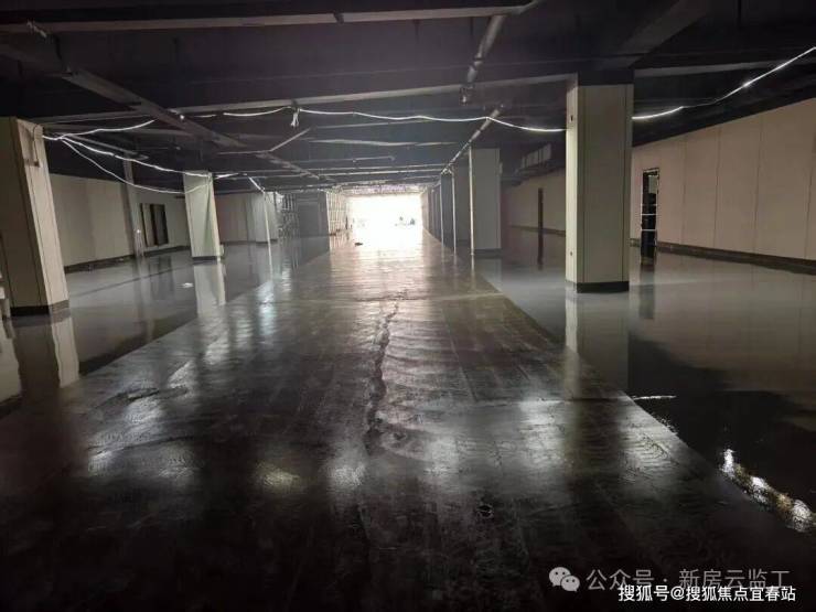 这是项目西侧的停车场出入口,可以看到停车位已经在做地坪漆了,墙漆也都已经刷好了,但停车场内部并没有做吊顶(目前仅在出入口位置有吊顶)。
