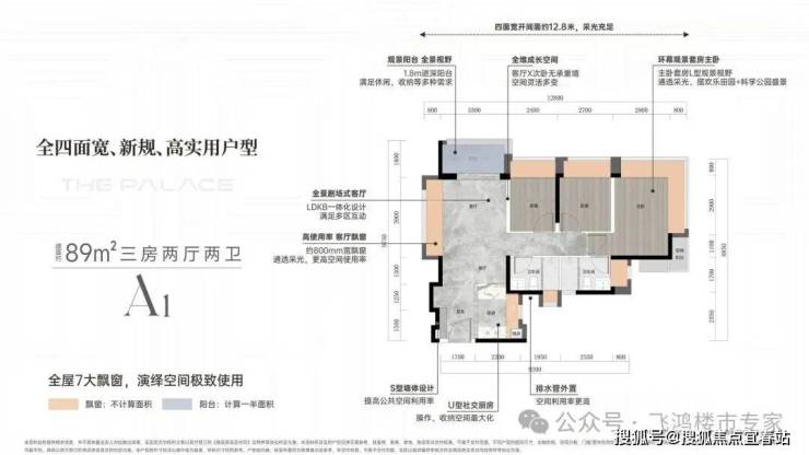 设计的是竖厅格局,客厅3.3米开间,LDKB一体化,S墙设计预留双开门冰箱位,客厅3.9米长的飘窗面无敌视野,四面宽开间面约12.8米,动静分区,主卧270°无柱转角飘窗,分别做到了主卧17.28m²/次卧9.99m²/次卧8.88m²(包含墙体飘窗),U型厨房,卫生间干湿分离,客厅阳台5.94m²西北朝向,看科学公园景观。户型亮点
