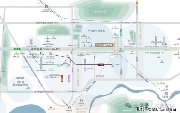 中信国际大厦,屹立福田中心区、华强北科技中心、红岭路新兴金融产业带三大中心聚合之地,揽藏深南大道5公里精粹——140家百强名企、百万平繁华商圈、六家全配套酒店、便捷市政资源环绕,成就企业的总部优选。