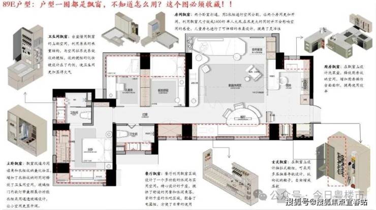 这里89E户型可以改为3+1房四房,但是虽然说是改四房但是是牺牲了餐厅改为房间,他把餐厅放到了飘窗位但是有点拥挤,或者可以学润宏城一期把餐厅放到厨房一体化,当然如果不改四房单纯做三房两卫,这个户型还是挺能打的,整体空间都挺大,而且还是双面采光。