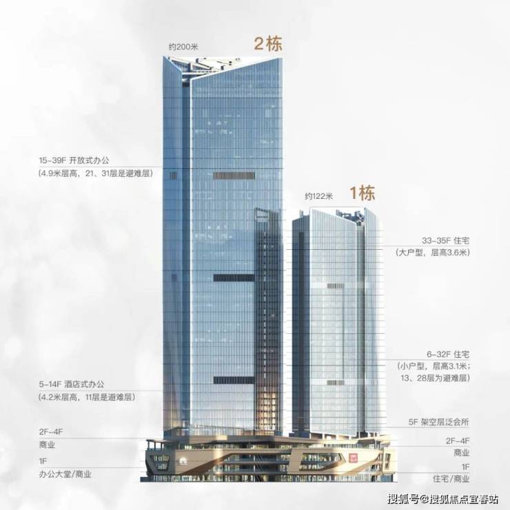 通过两栋塔楼前后错开的巧妙定位,成功实现海景朝向最大化,避免楼与楼之间的对视。高度上有高低落差的关系,从澳门方向看金融岛,两栋塔楼既互为映衬又互不遮挡,形成靓丽的风景。