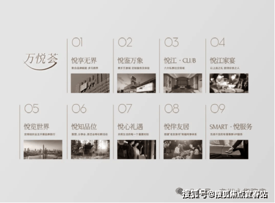 内部「万悦荟」整合多元业务领域,联手行业领先国际品牌,为业主带来系统化、定制化的全新滨江万象生活方式,包括:悦享无界、悦鉴万象、悦江·CLUB、悦江家宴、悦览世界、悦知品位、悦心礼遇、悦伴友居、SMART·悦服务9大权益。