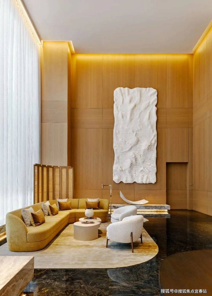 约 11 米层高、450㎡的主入户大堂,是归家的第一重仪式感。天然石材的温润纹理、实木饰面的细腻质感与金属线条的简约利落交织相融,搭配定制艺术吊灯—— 其设计灵感源自华侨城湿地的水草形态,以向上的艺术形态,将自然生机融入空间。