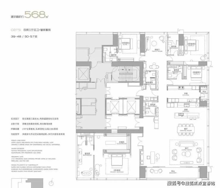 568-1032㎡定制大平层 / 复式,层高最高 3.9 米,私梯入户,5+1 房起的布局适配家族聚居需求,高区户型可享 270° 环幕海景,为塔尖家族打造传世级居住空间。