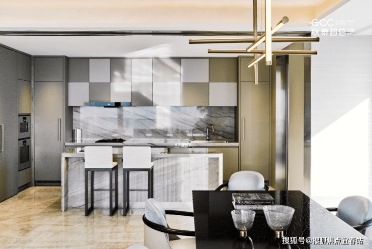以 “空间讲述故事” 为核心,将天光海韵凝练为日常空间。客餐厅采用玻璃幕墙设计,270° 海景视野无遮挡,天然石材地面与木饰面墙面相融,定制艺术吊灯打造层次丰富的光影氛围;主卧双开门礼序入户,Rimadesio 玻璃隔断搭配金属格栅背景,以极简设计凸显奢华本质;全房智能系统与进口洁具橱柜,让科技与质感融入生活点滴。