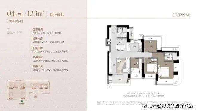 123㎡4房2卫(东南向)景观优势:东南向低区直面社区花园,主卧采用270°转角飘窗,搭配独立卫浴与衣帽间,营造酒店式居住体验。空间设计:四房格局方正,次卧连通景观阳台,适合注重居住格调的改善家庭。