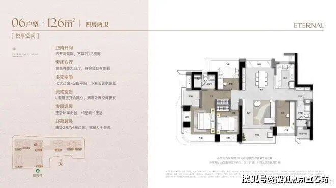 126㎡4+1房2卫(朝西,客厅南北向)视野特色:傍晚可赏落日余晖,客厅南北通透保障空气对流;4+1房灵活空间可按需打造茶室或家庭影院。细节配置:全屋多飘窗设计,主卧曲面采光提升空间通透感。