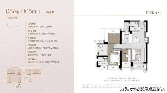 105㎡3+1房2卫(西南向)功能布局:灵活3+1房设计,弹性方厅可改造为书房或儿童活动区,西南向低区推窗即揽花园绿意,主卧配置步入式衣帽间。通风采光:通过优化开窗比例,实现南北通透与三面采光