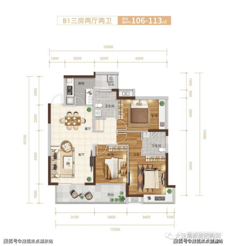 B1户型:106-113㎡三房两厅两卫