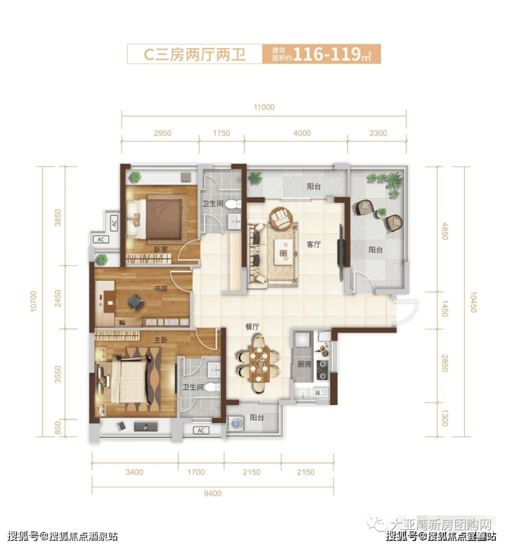 C户型:116-119㎡三房两厅两卫