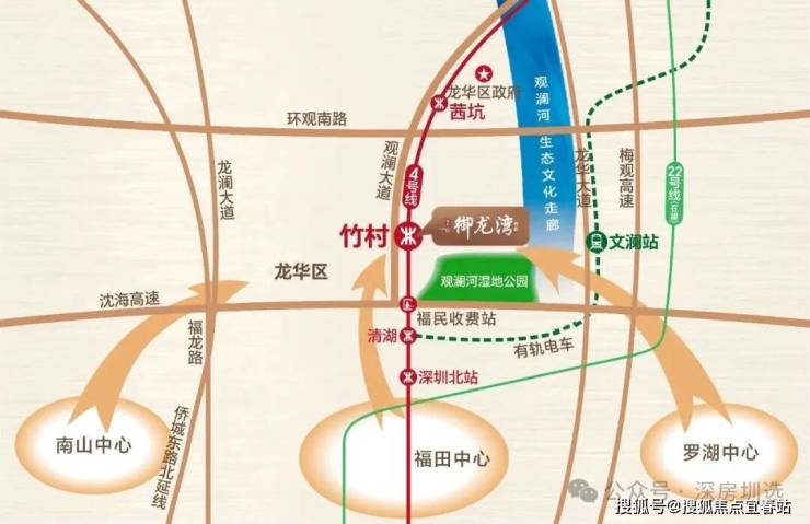 轨道交通:地铁4号线竹村站上盖,商业MALL直连,停车场直连地铁出入口,7站速达深圳北、13站钟直达福田中心,对接深港生活圈;电车文澜站,直线距离约500米,地铁22号线(在建中)。