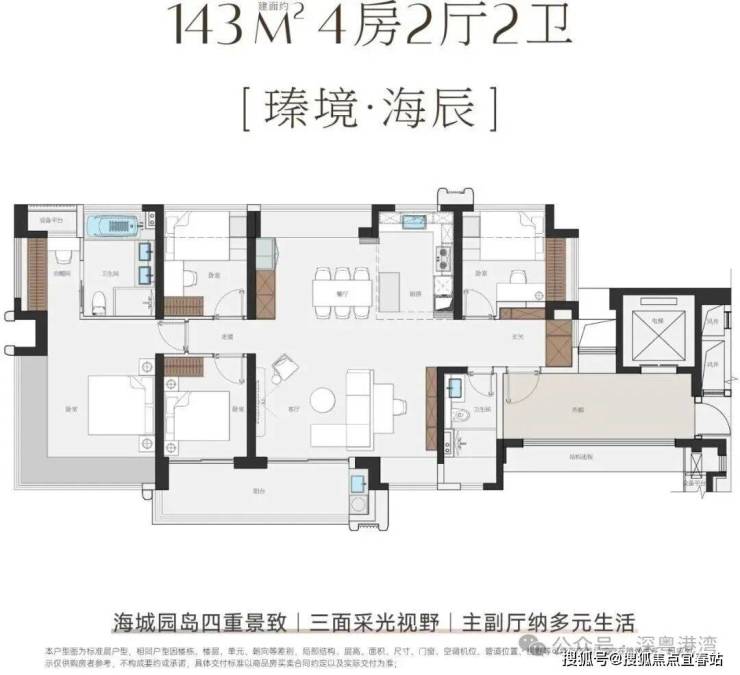 户型方面,主推建面115㎡-143㎡四房,户型使用率超100%,最大可达108%,最高赠送面积近44㎡。